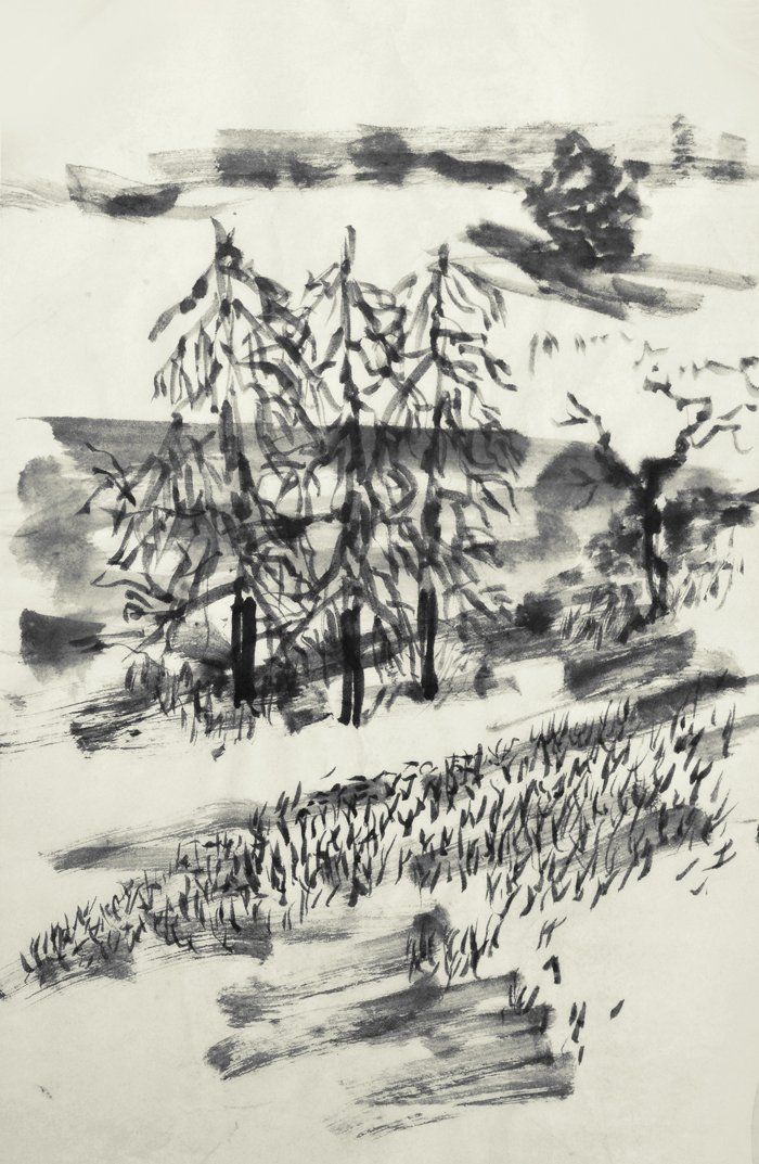Oliver Kolibabka, "Am See", Tusche auf Japanpapier, 21,7 x 35 cm, 2018
